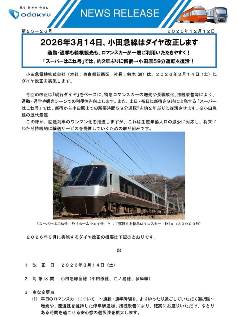 2026年3月14日に小田急線のダイヤが改正されます。