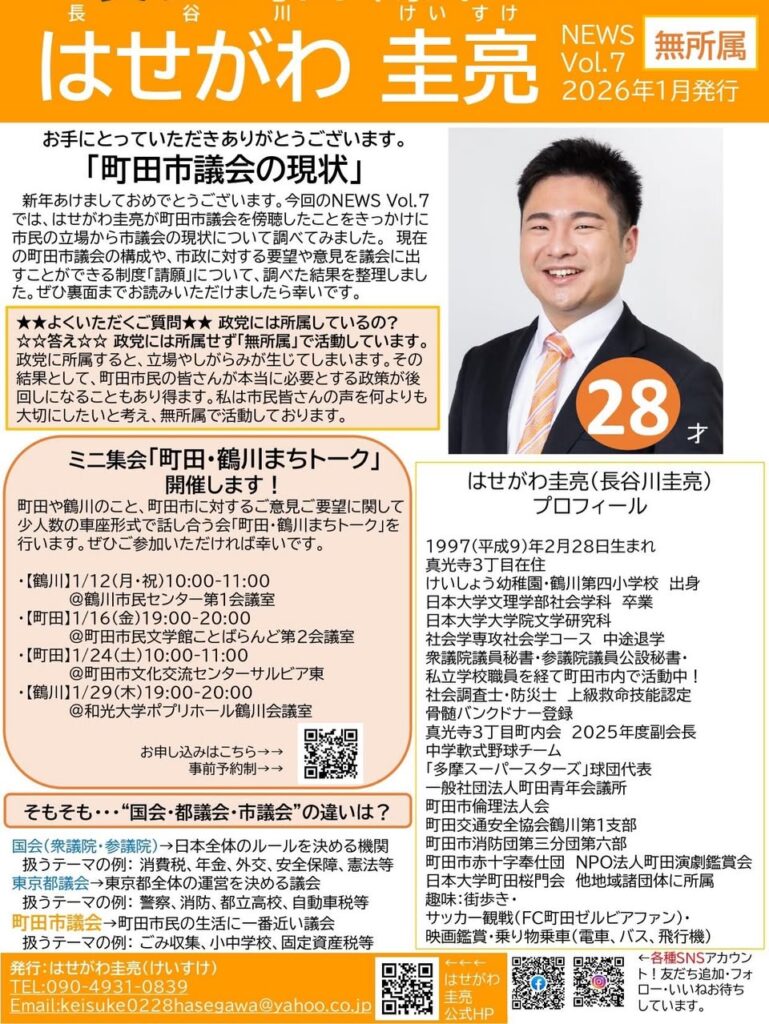 自身の政治活動チラシとして駅頭やポスティングでお配りしている「はせがわ圭亮NewsのVol.7」が完成しました!明日1/5からの鶴川駅頭並びにポスティングにて配って、配って、配りまくります。