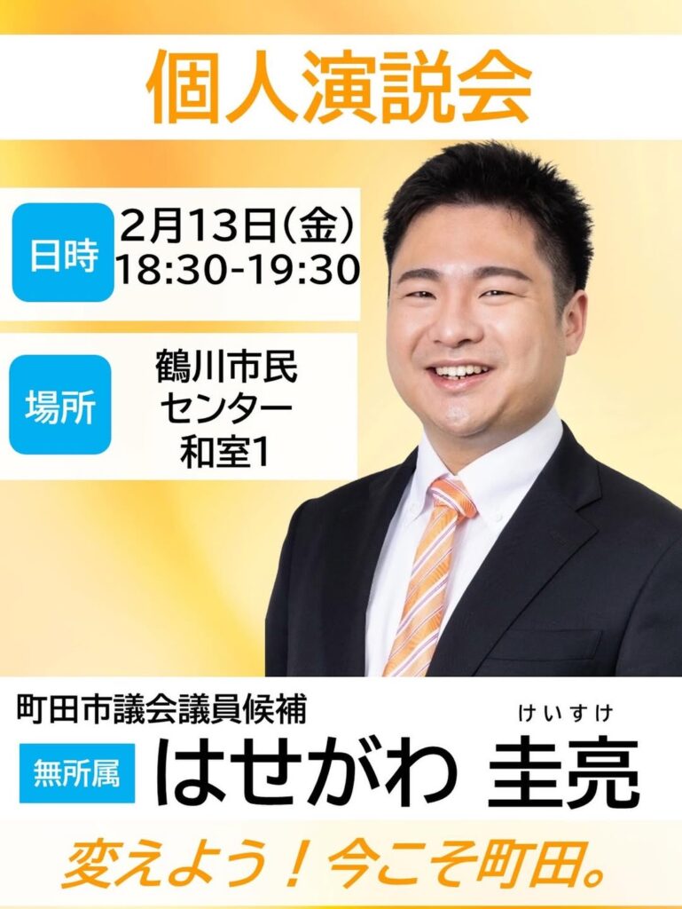 【個人演説会にお越しください!】2/13(金)18:30-19:30に鶴川市民センターの和室1にて「はせがわ圭亮」の個人演説会を行います!ぜひお越しください演説会の前後で期日前投票も可能ですよろしくお願い致します#はせがわ圭亮 #町田市議選 #鶴川 #町田 #町田市