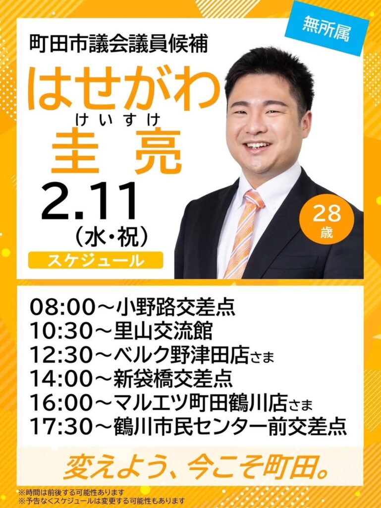 町田市議選最年少候補のはせがわ圭亮です。
