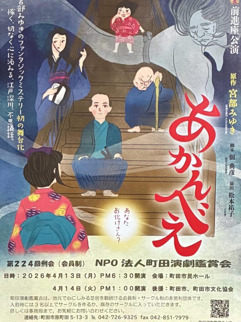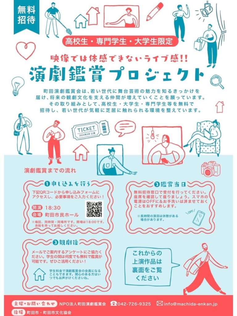 私も会員であるNPO法人町田演劇鑑賞会では高校生・専門学生・大学生向けに無料で演劇鑑賞できる「演劇鑑賞プロジェクト」を行なっております!4/13(月)に行う公演「あかんべえ」でも観ることができます。
